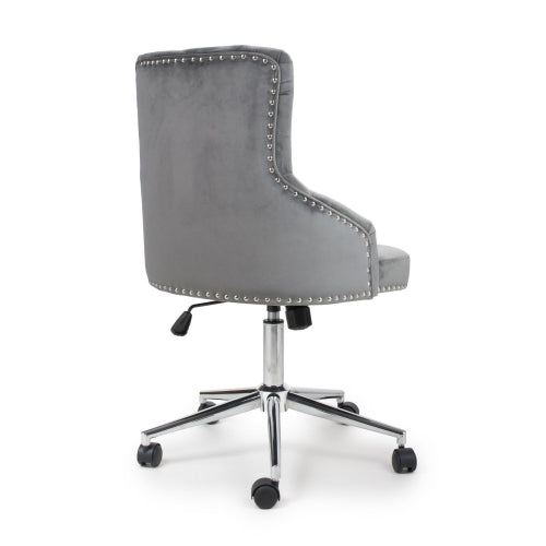 A luxurious office chair enhanced by attractive stud detail edging and tufted button back, upholstered in grey brushed velvet. Complete with comfortable chrome base and castors. Assembly required. Sold individually. Available in Grey and Mustard Yellow