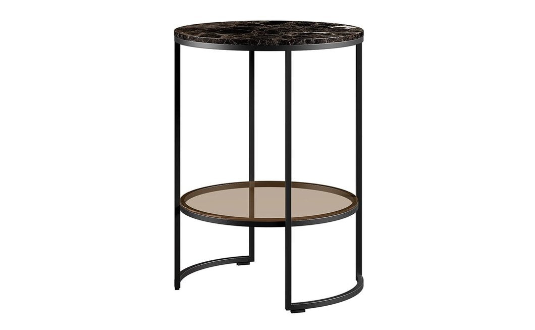 Simple and classic elegance inspired the design of the Shak Side Table . But it's not the traditional manifestation of simplicity. Though is circular design may be relatively simple, it boasts a unique black marble top and a tempered glass shelf offering a vintage-esque finish.